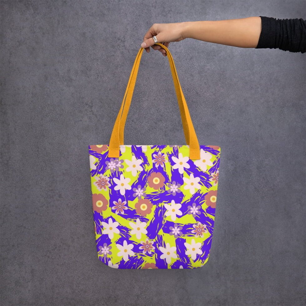 Tašas apdrukā izmantots stilizēts ziedu motīvs uz dzelteni zaļa fona, kas savijas ar ekspresīviem, violetiem otas triepieniem. Šis apdruka piešķir somai rotaļīgu un vasarīgu izskatu.