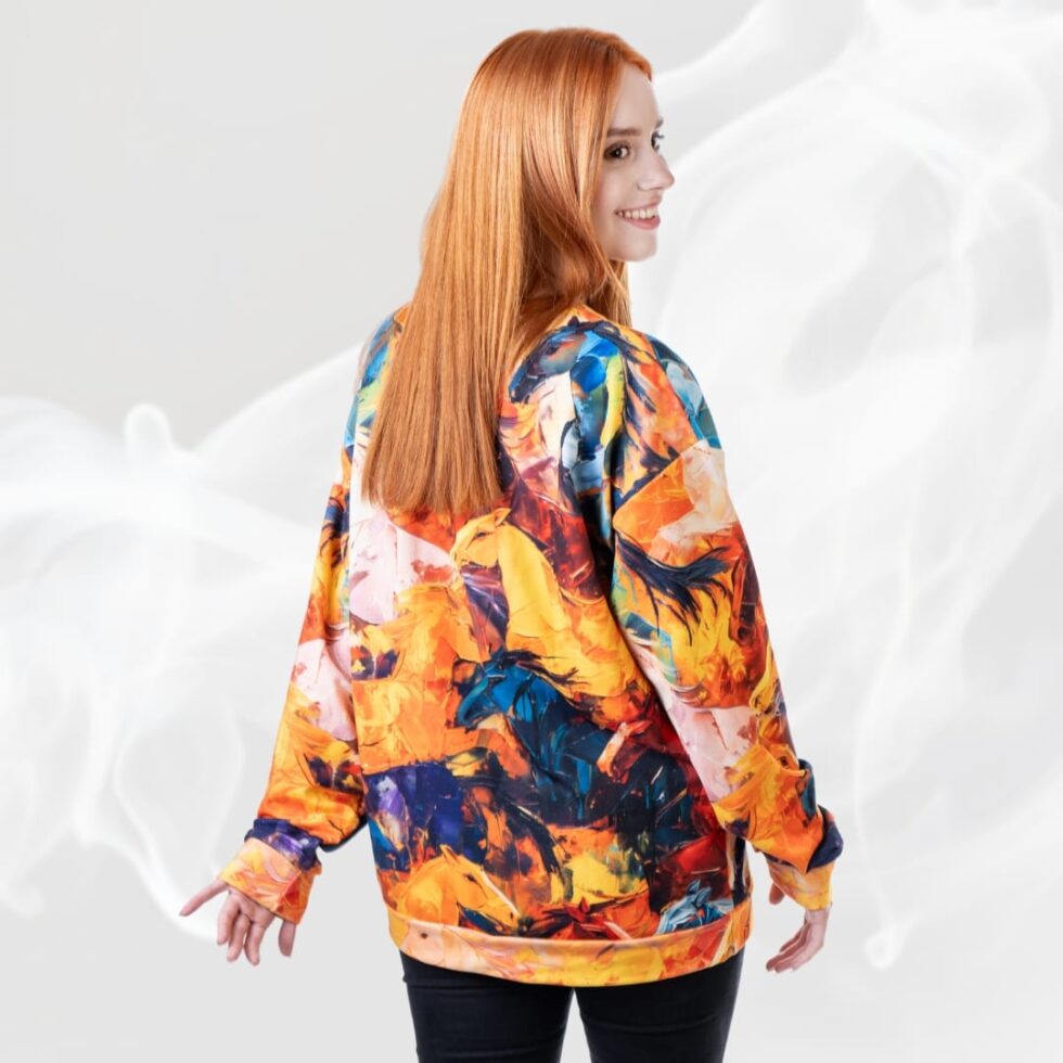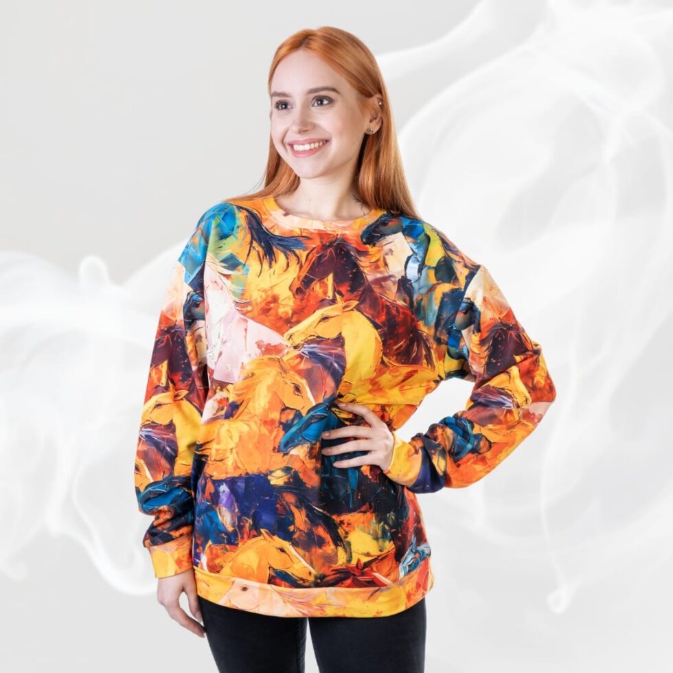 Džemperis ar auļojošu zirgu apdruku ir veltījums 2026. Ugunīgā zirga gadam. Tas ir kā talismans sievietei, kura droši dodas pretī saviem mērķiem, jo džemperis izstaro nepieradinātu brīvību un mērķtiecību.
