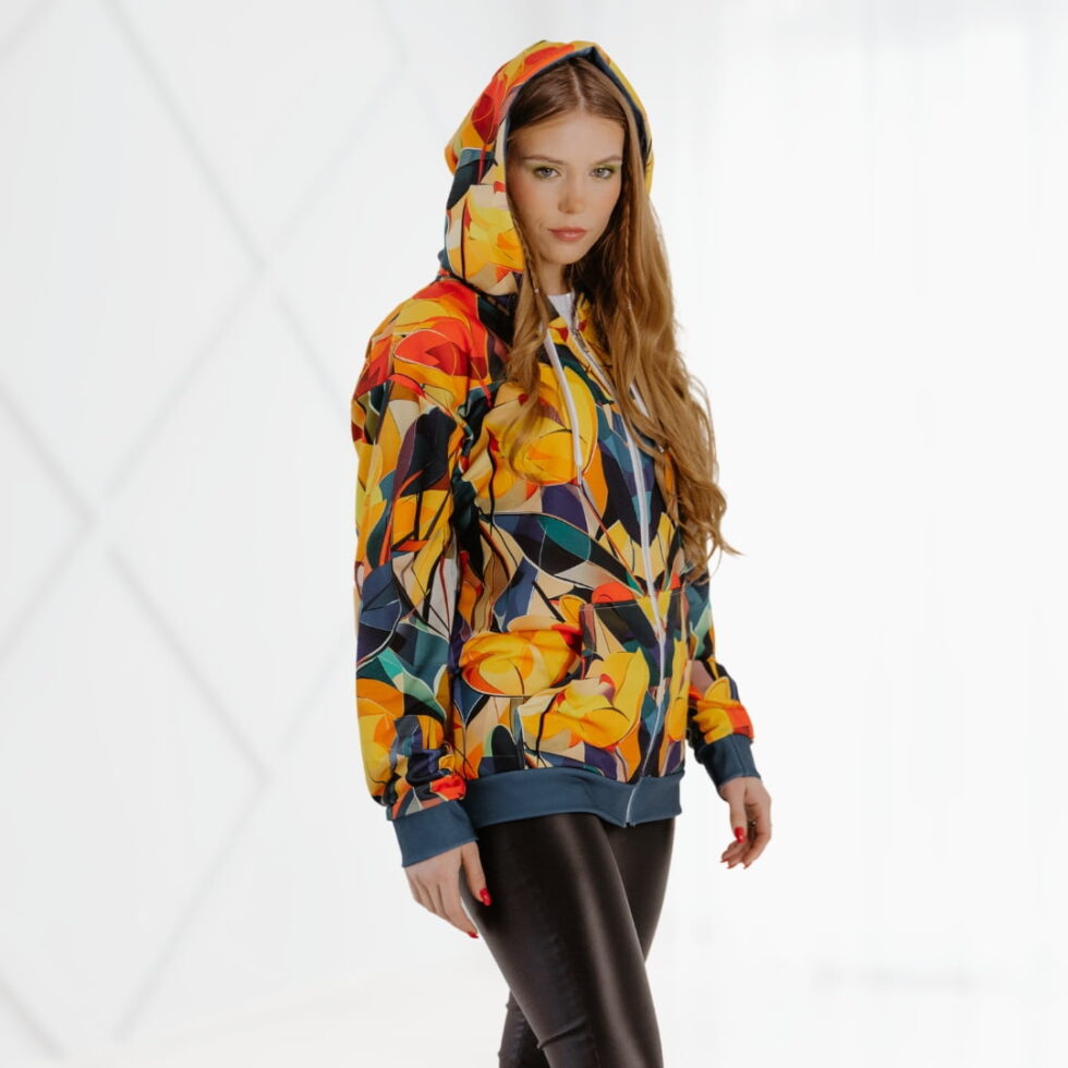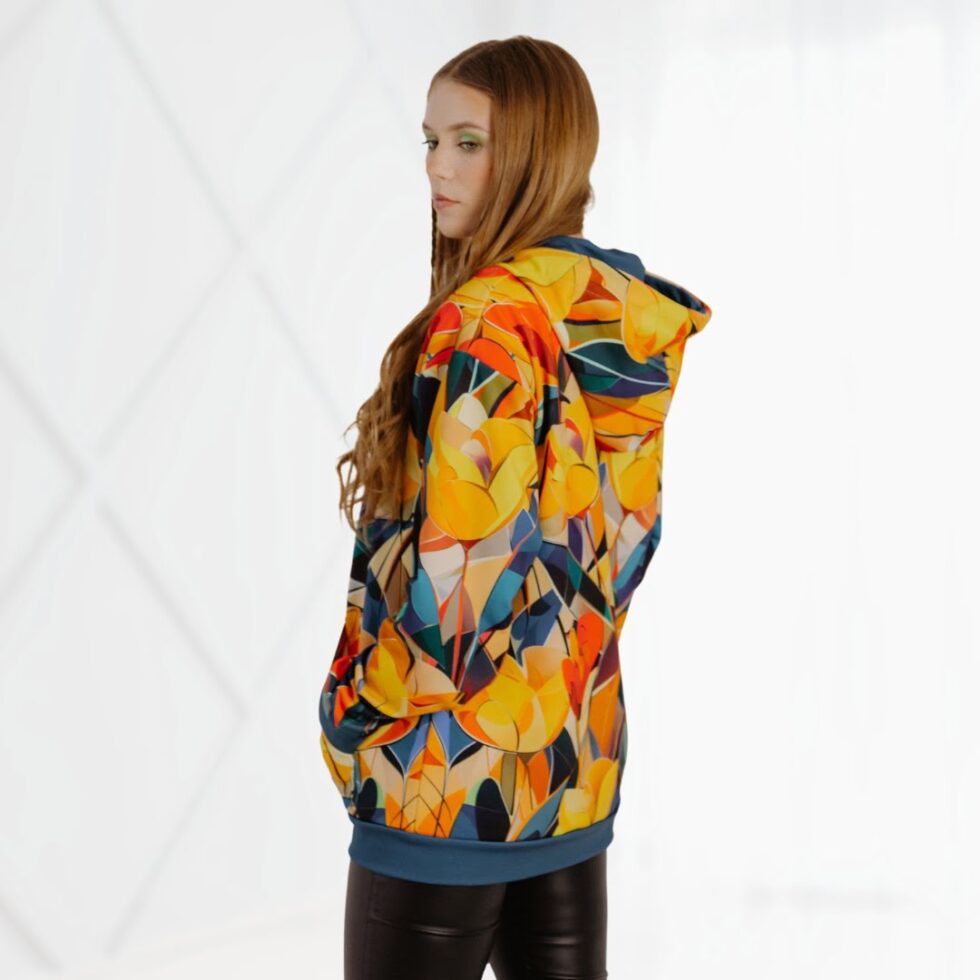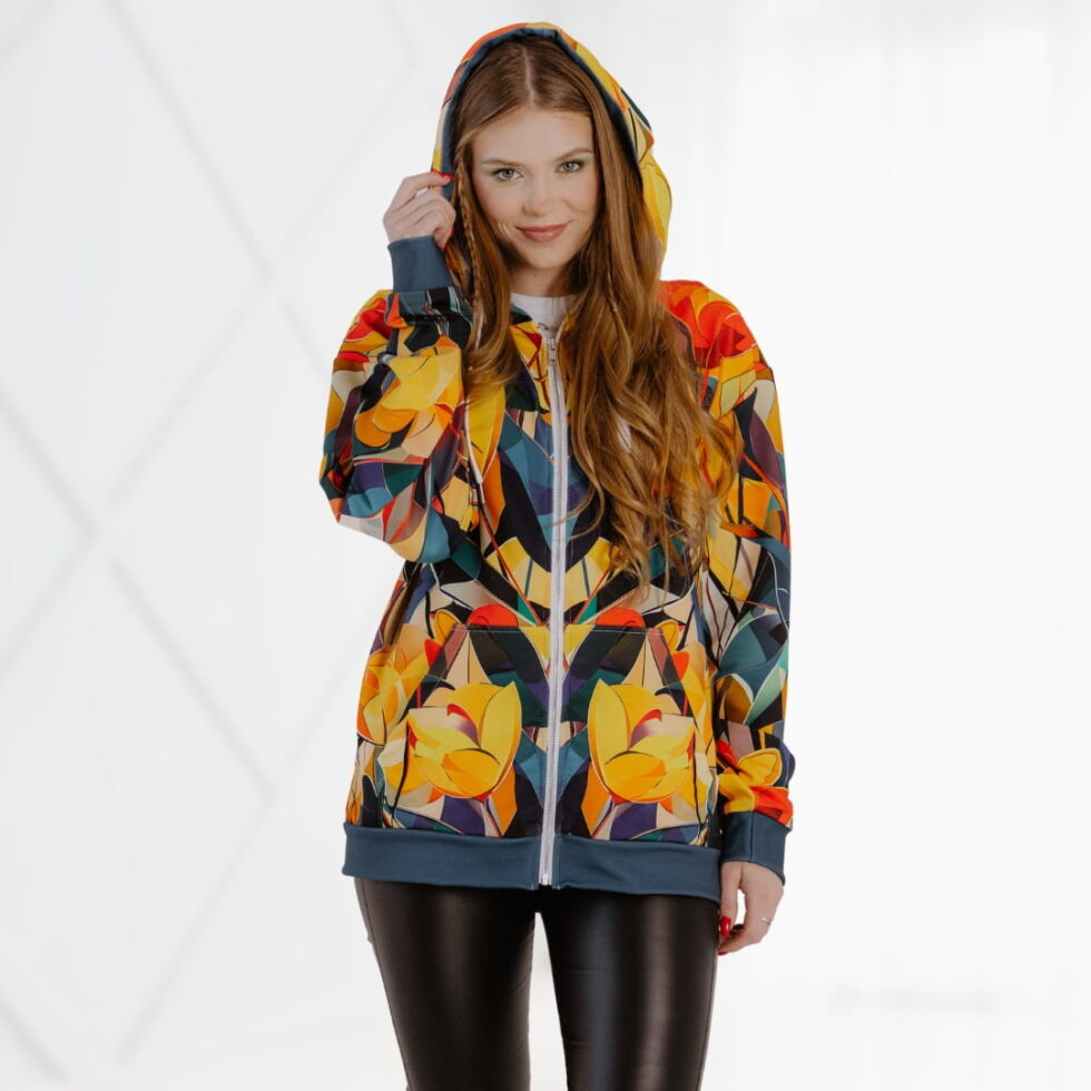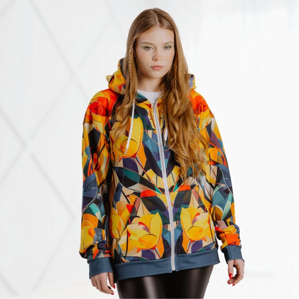 Jakai ar kapuci “Rebeka” ir koša tulpju motīva apdruka. Tā ir mūsdienīga izvēle, jo šis produkts apvieno sevī ilgtspējību un stilu. Jaka ir izgatavota no atkārtoti pārstrādāta poliestera un apdrukāts sublimācijas tehnikā. Jakas kapuce ir no dubulta auduma, bet pati jaka ir mīksta un patīkama.