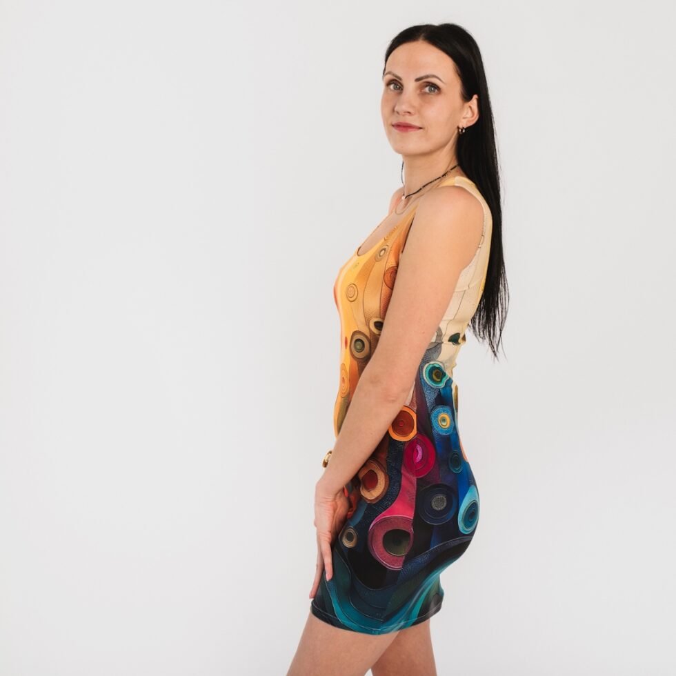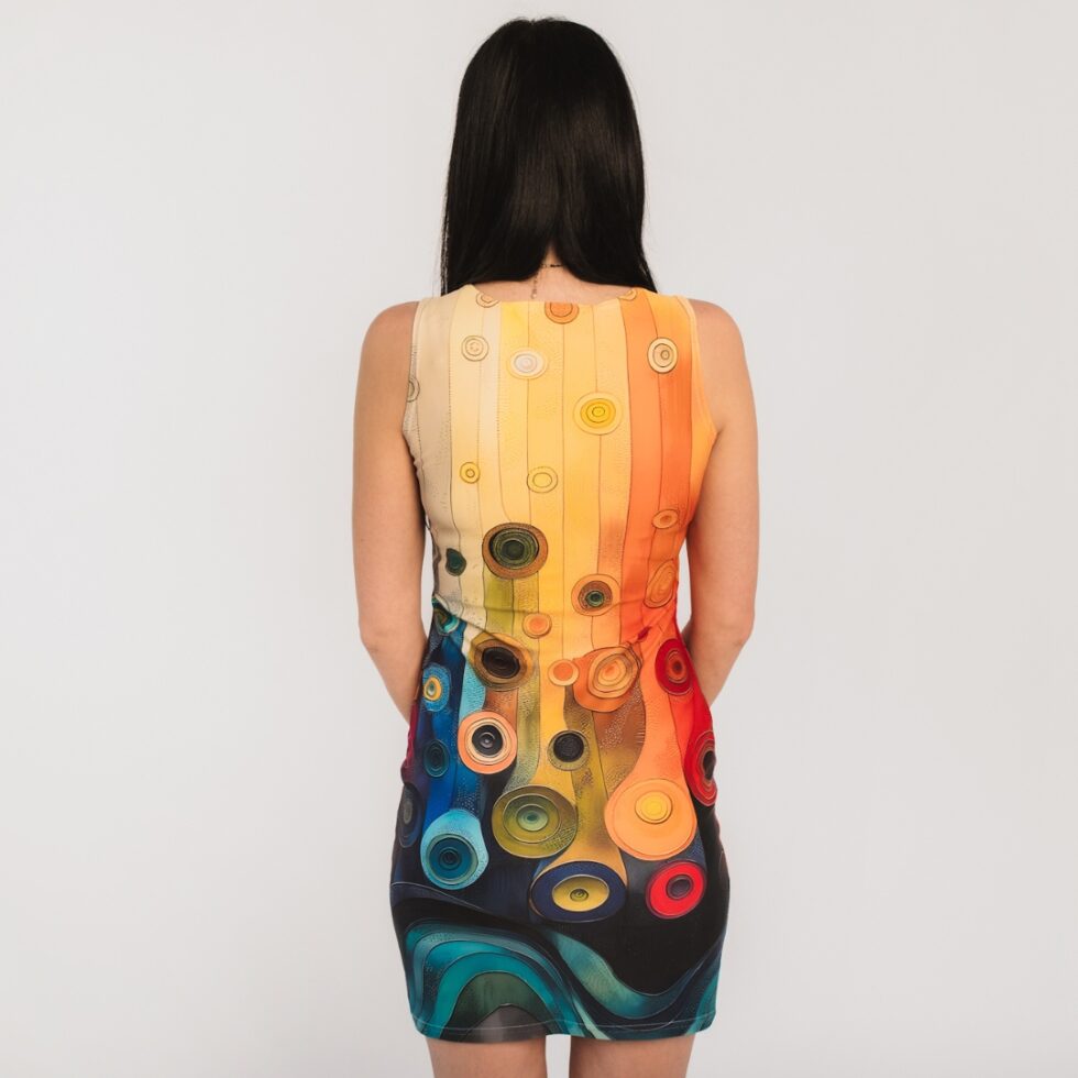 Augumam pieguloša zīmuļkleita “Eva” ir tik praktiska un ērta, ka iemīlēsi to uzreiz! Kleitas dizains veidots kā dinamisks apļu raksts, kurā abstrakti saplūst dažādi apļi un krāsu laukumi. Raksts veido pakāpenisku pāreju no siltiem toņiem augšpusē uz tumšākiem, spēcīgākiem toņiem kleitas apakšējā daļā. Šī unikālā krāsu gamma piešķir kleitai dzīvīgumu un vizuālu dinamiku.