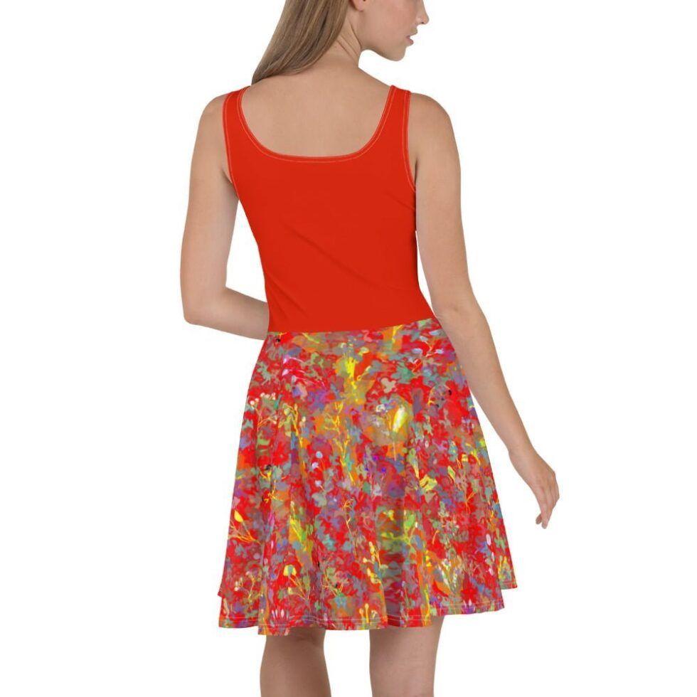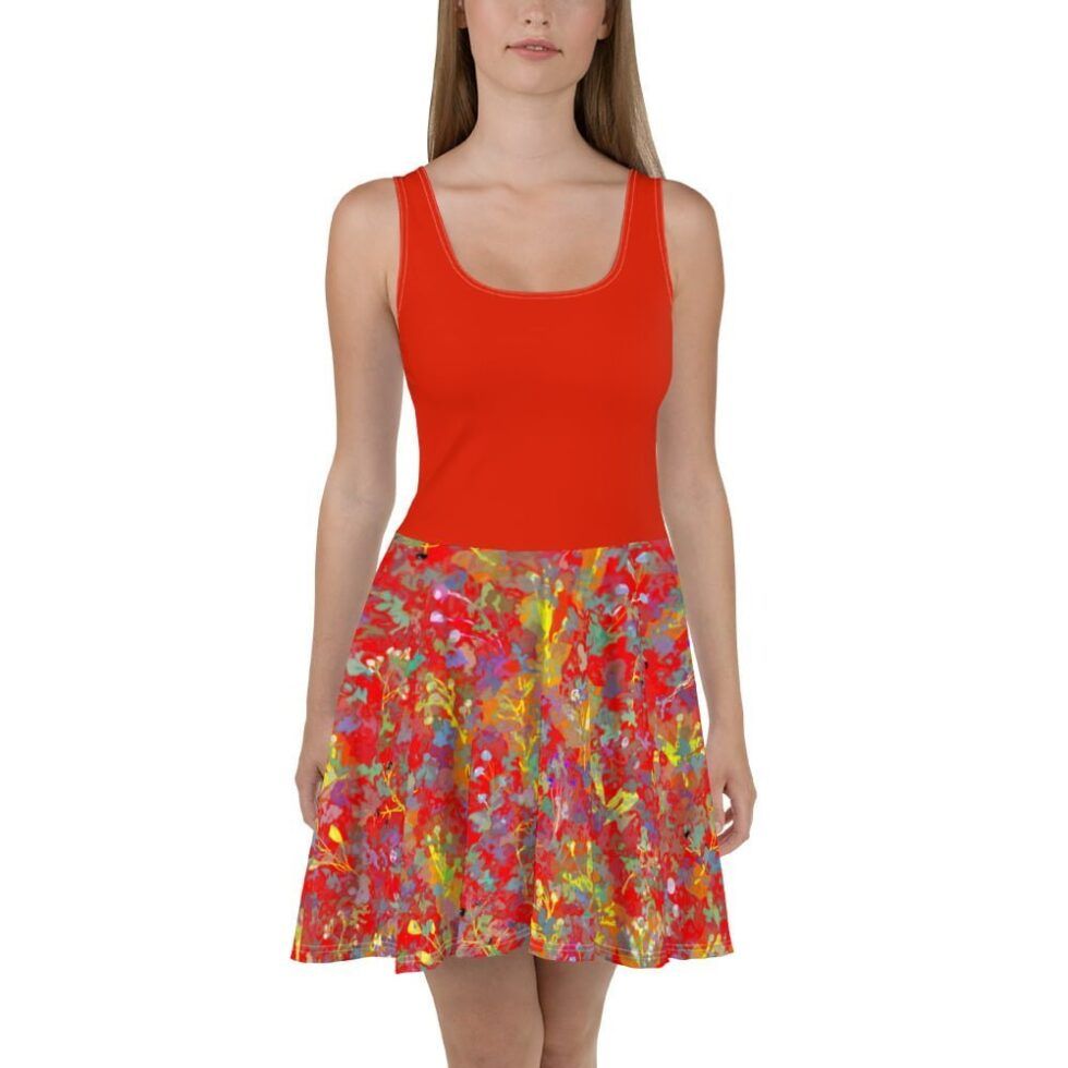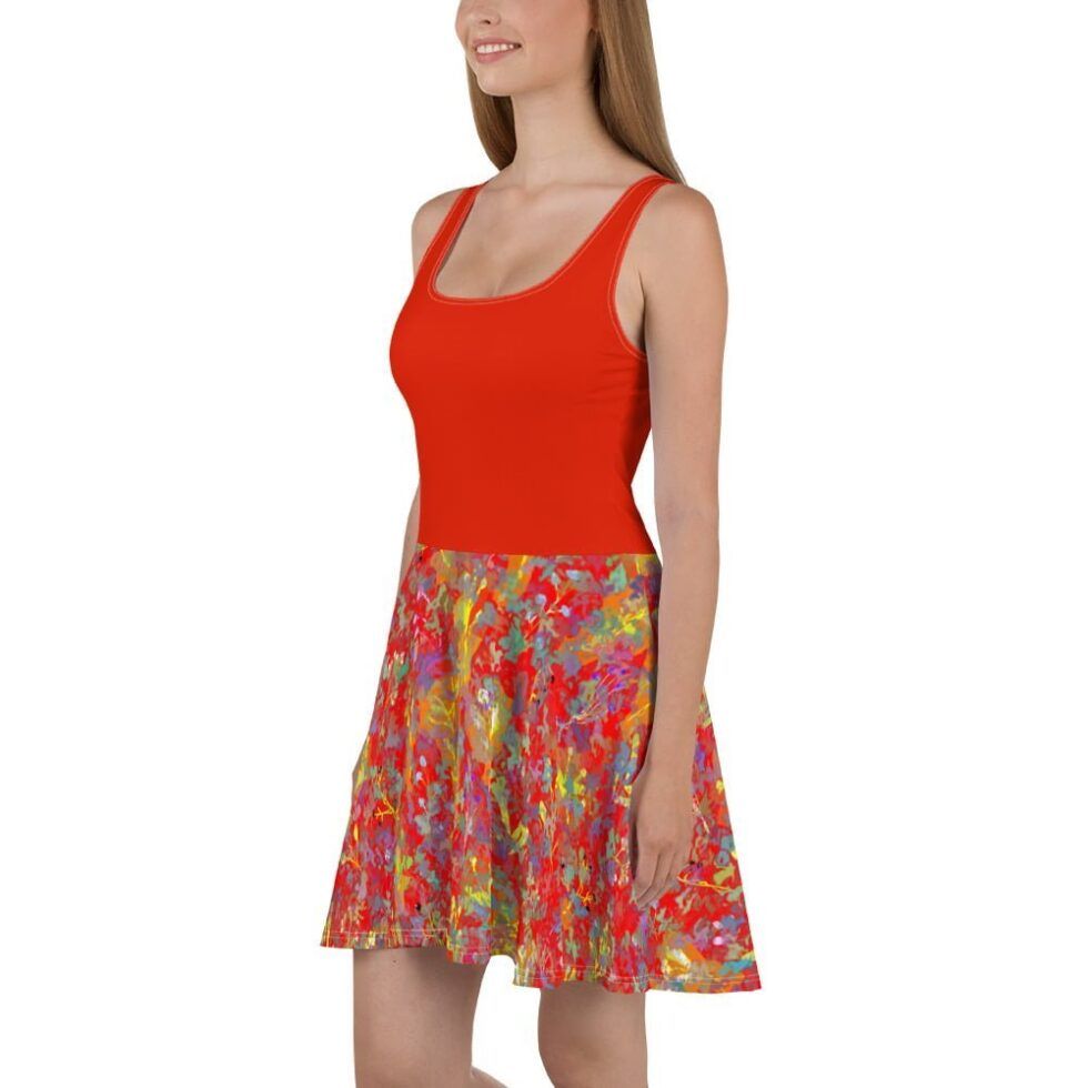 Šī ir burvīga saules griezuma kleita ar divdaļīgu dizainu – sarkans tops un krāsaini, abstrakti svārki. Izgatavota no mīksta un elastīga auduma, šī vasaras kleita nodrošina maksimālu komfortu. Ideāla izvēle, lai radītu stilīgu, sievišķīgu un radošu tēlu.
