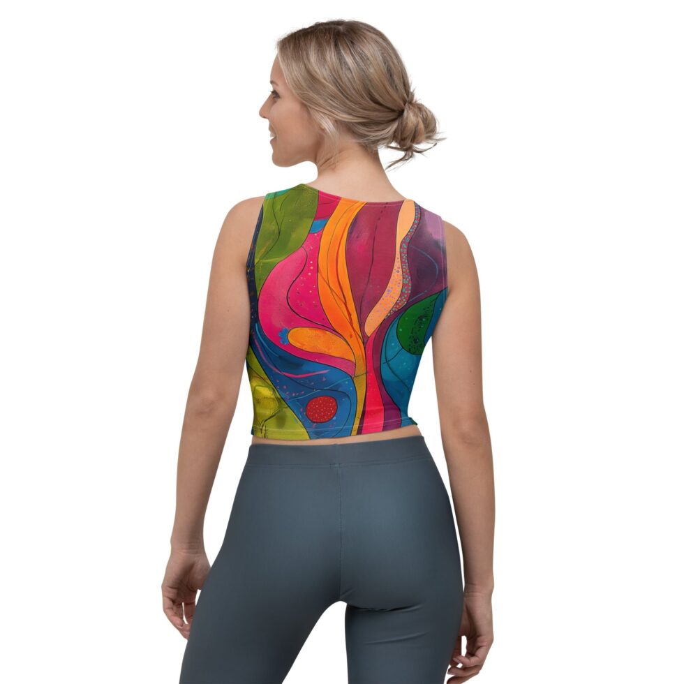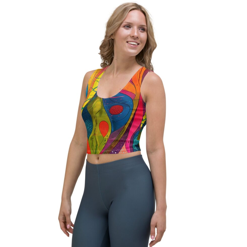 Iedvesmojies ar šo īso sieviešu topu! Tā dinamiskais, abstraktais dizains ar košām krāsām iedvesmos Tevi aktivitātēm. Izgatavots no mīksta un elastīga auduma ar platām lencēm, tas nodrošinās komfortu un atbalstu sportā vai ikdienā. Ideāla izvēle, lai piešķirtu krāsu un enerģiju Tavam tēlam.