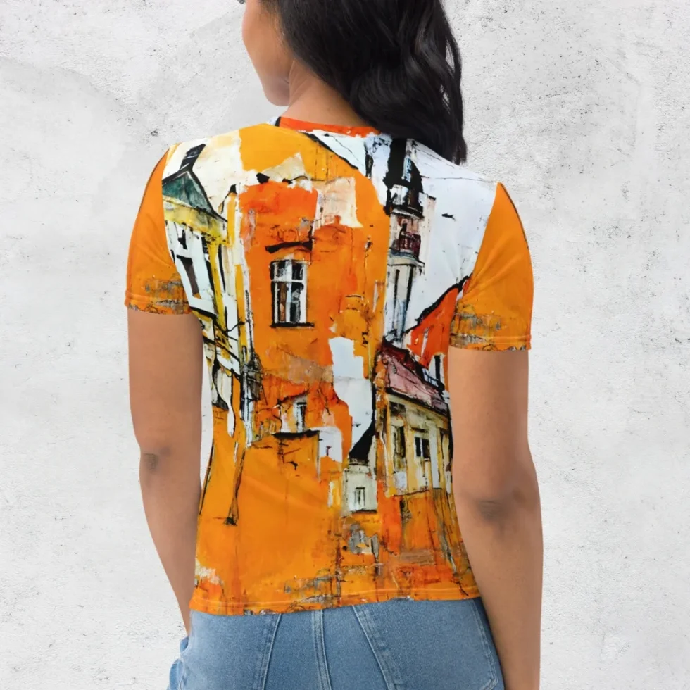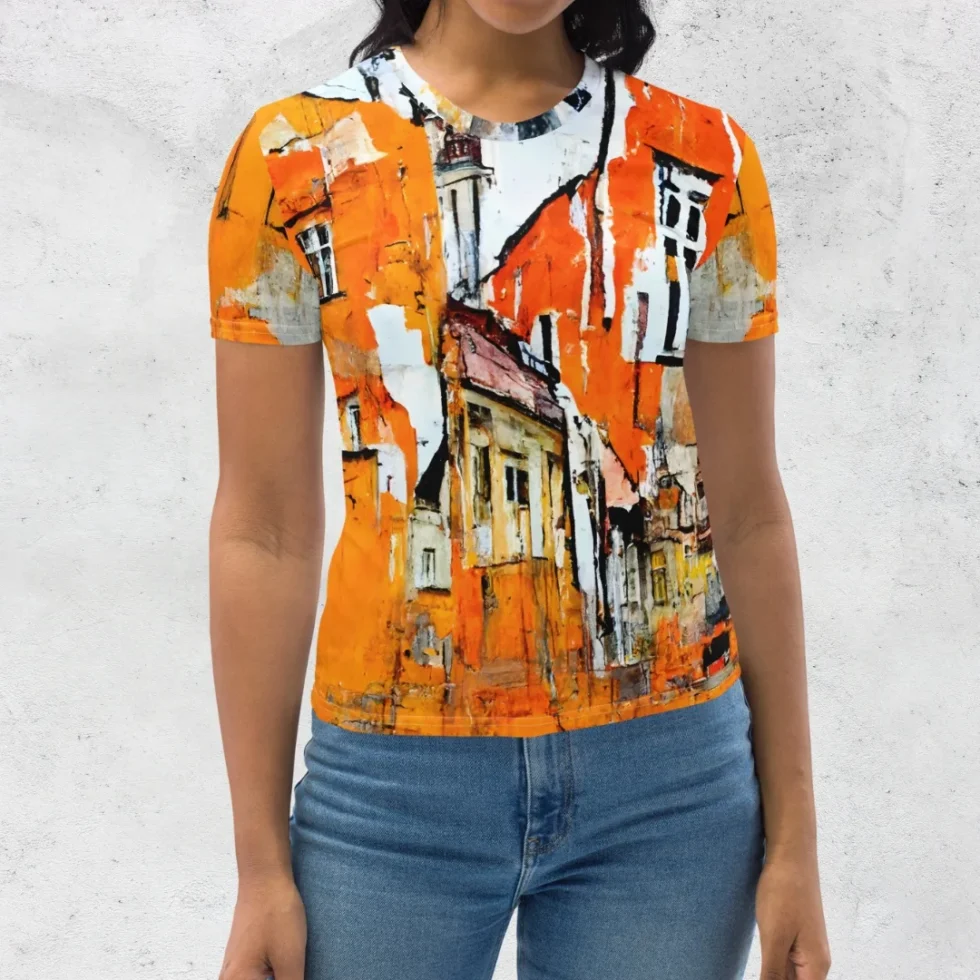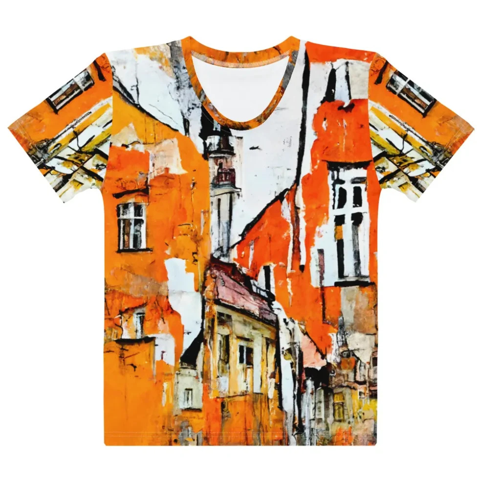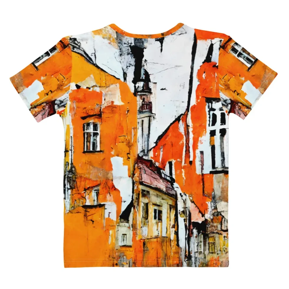 Izcelies ar šo sieviešu T-kreklu ar pilsētas ainavas apdruku, kas veidota akvareļu stilā! Šis mākslinieciskais T-krekls ir radīts, lai atspoguļotu Tavu mīlestību pret urbāno vidi un atspoguļotu Tavu radošo personību apģērbā.