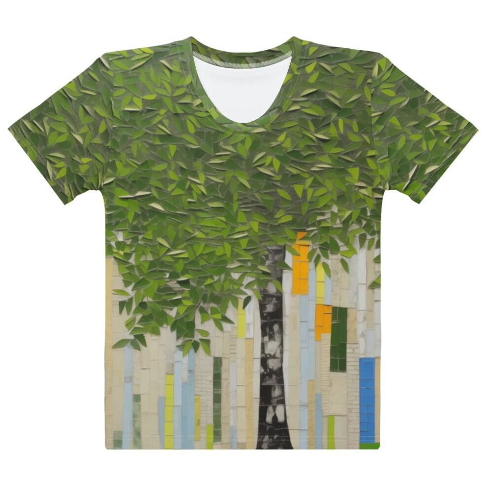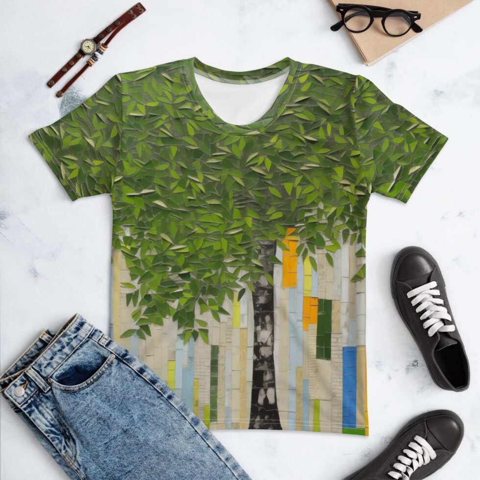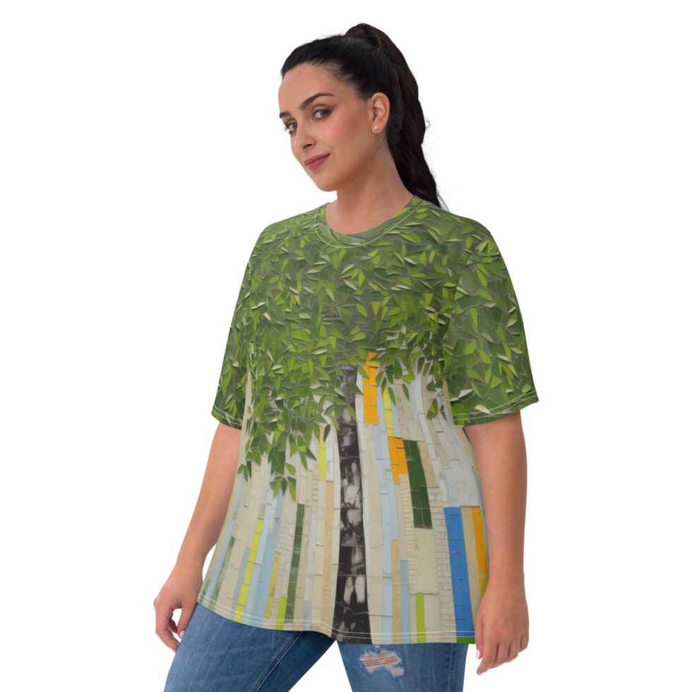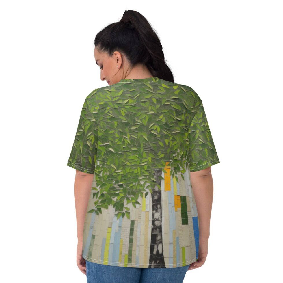 T-krekla dizaina galvenais akcents ir māksliniecisks koka attēls, kas veidots mozaīkas tehnikā, ar dažādu formu un toņu gabaliņiem, kas rada dziļumu un faktūru. Spilgtais zaļā lapotne kontrastē ar melnbaltajiem stumbriem, bet fons ir abstrakta vertikālu joslu kolāža, kurā mijas zili, dzelteni, oranži un balti toņi.