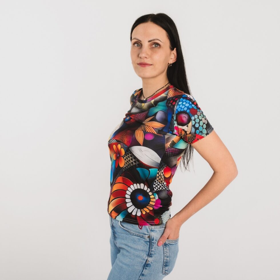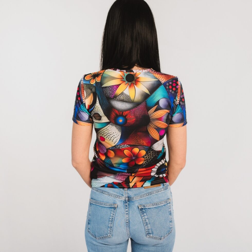 Pievērs uzmanību šim košajam sieviešu T-kreklam! Tā dinamiskā grafiskā apdruka ar abstraktiem ziediem un mandalu elementiem piešķirs Tavam tēlam neatkārtojamu šarmu. Klasiskais apaļais kakla izgriezums padara to par praktisku un ērti kombinējamu apģērbu.