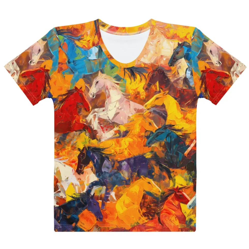 Šis T-krekls ar zirgu auļojošu zirgu dizainu ir drosmīga un stilīga izvēle. Tā unikālā apdruka ar abstraktiem zirgu attēliem ir radīta, lai tu izceltos. Izgatavots no mīksta un elastīga materiāla, tas nodrošinās nevainojamu komfortu visas dienas garumā.