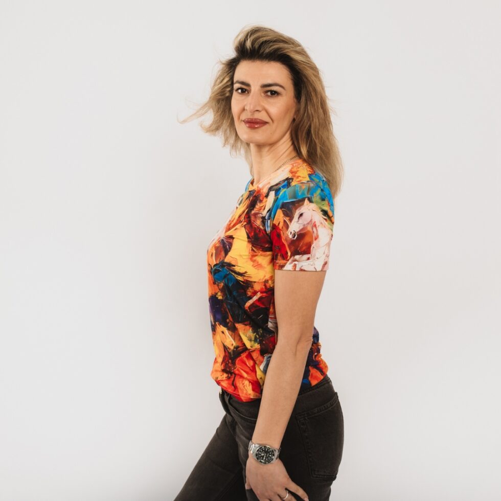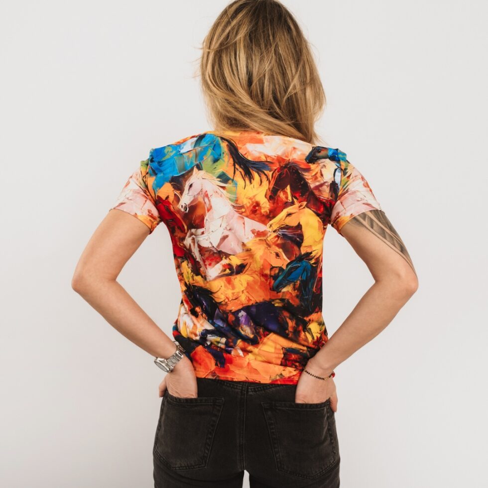 Sieviešu T-krekls “Jodie” ar stilizētu joņojošu zirgu dizainu simbolizē brīvību, spēku un saikni ar dabu, bet košās krāsas – dzīvesprieku un enerģiju. Oranžā, zilā un baltā krāsas rada dinamisku un dzīvīgu koptēlu, kas noteikti piesaistīs uzmanību.