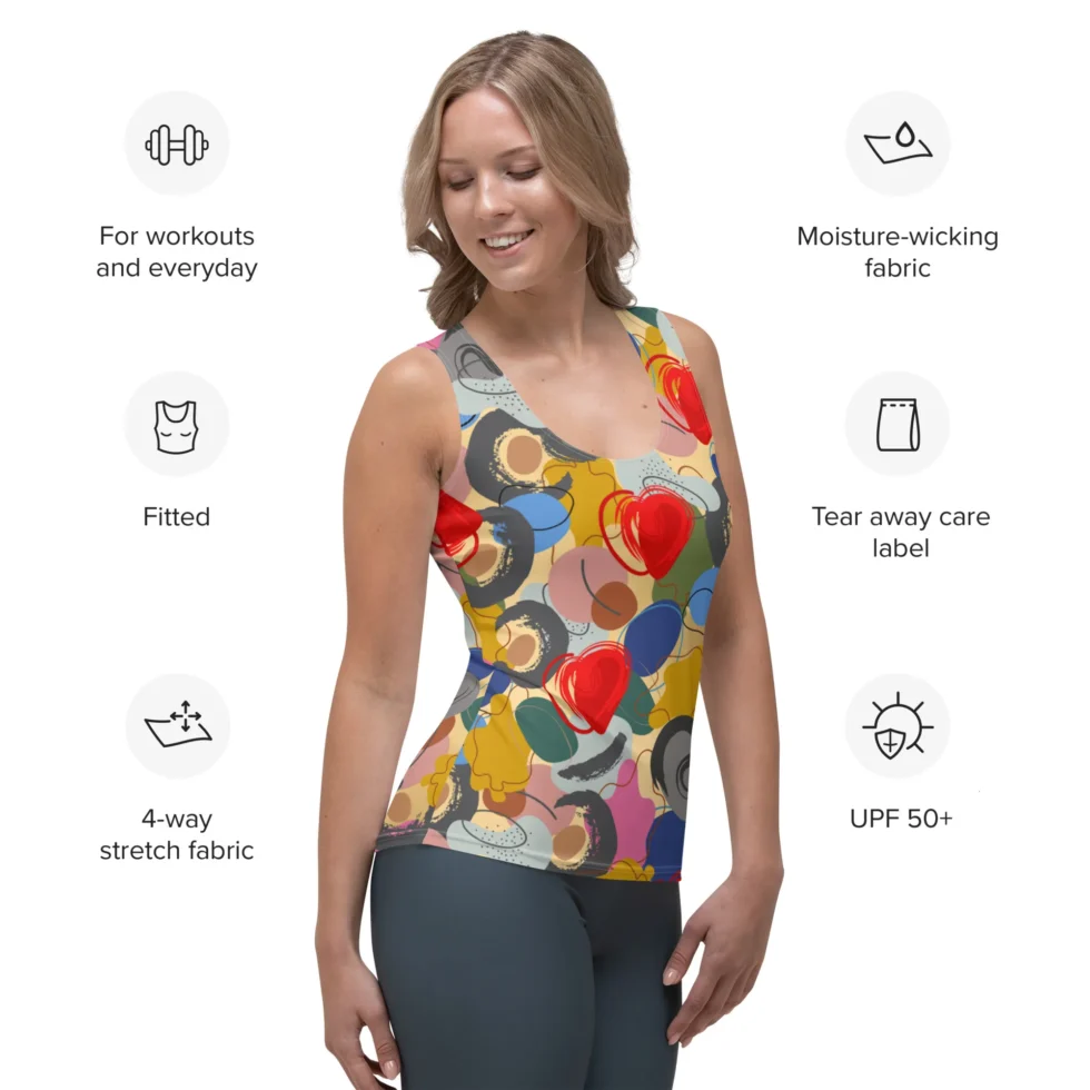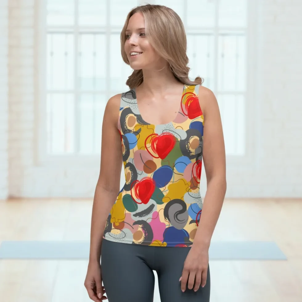 Pagarinātā topa modernais abstraktais raksts ir veidots no krāsainiem laukumiem, līnijām un sirds formas elementiem, kas saplūst kopā dinamiskā un rotaļīgā kompozīcijā. Dominējošie toņi – sarkans, dzeltens, zils un pelēks, padara šo topu par lielisku akcentu Tavam tēlam.