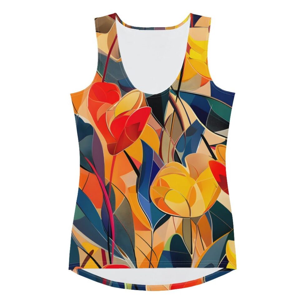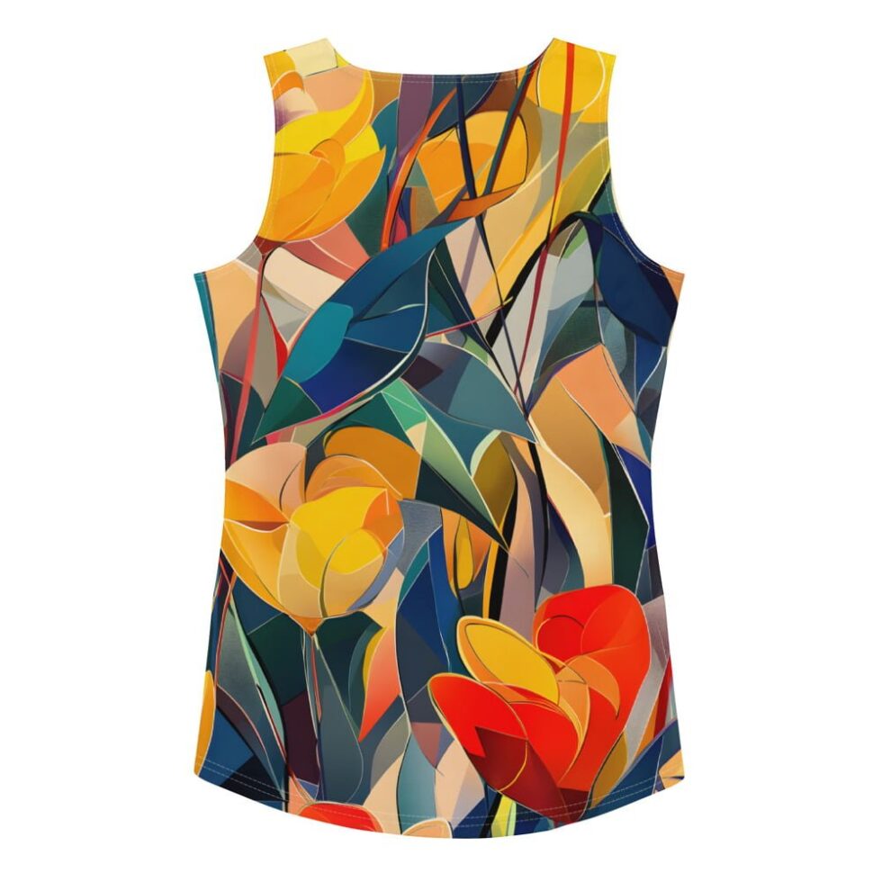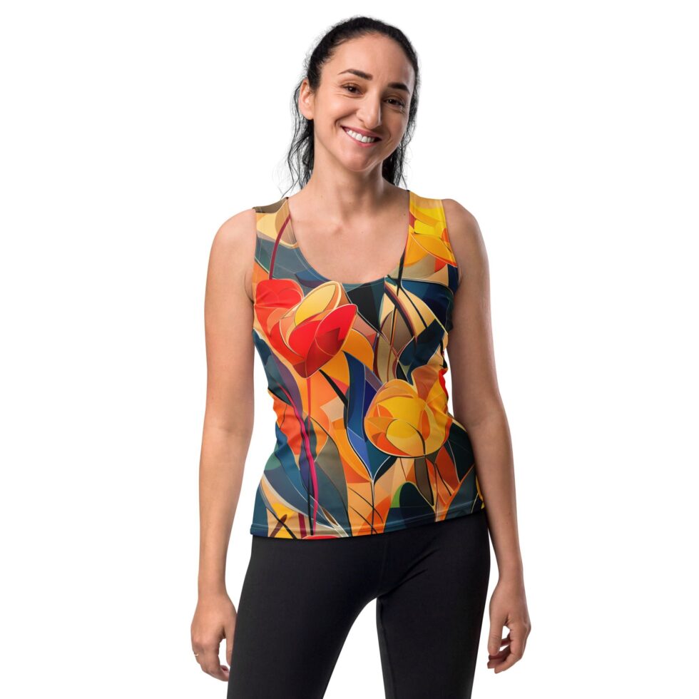 Košs tops bez piedurknēm ar spilgtu un modernu apdruku, kas apvieno ziedu formas un krāsu blokus. Krāsainais dizains ir veidots, lai tu justos unikāla un pārliecināta. Izgatavota no mīksta un ērta auduma, tā ir ideāla izvēle ikdienai, atpūtai un aktīvam dzīvesveidam.