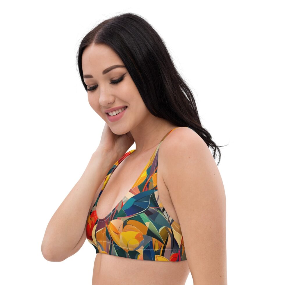 Bikini peldkostīma tops “Rebeka” ir vasarīgi košs un krāsains, ideāli piemērots vasaras piedzīvojumu baudīšanai! Tas ir kā vasaras ornamentu mozaīka – abstrakti ziedi dzeltenos, sarkanos, oranžos, zilajos un zaļajos toņos veido dzīvīgu, ritmisku rakstu.