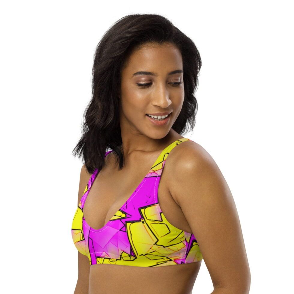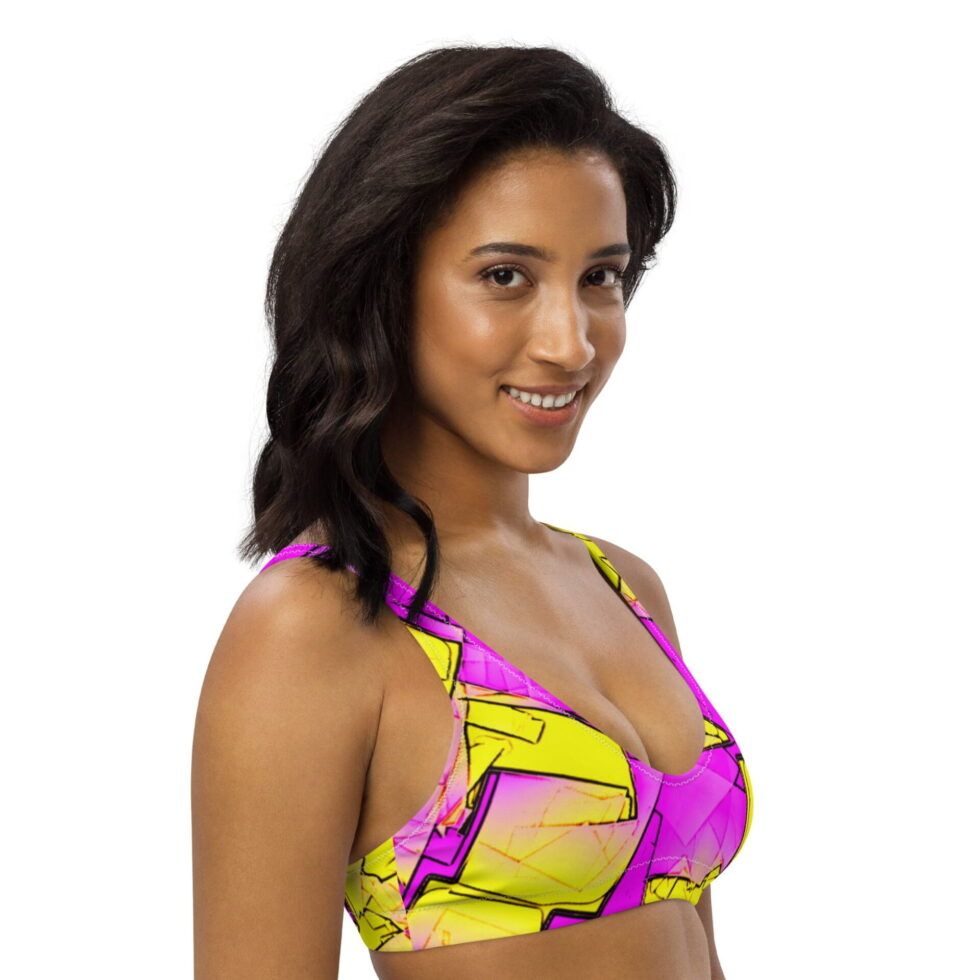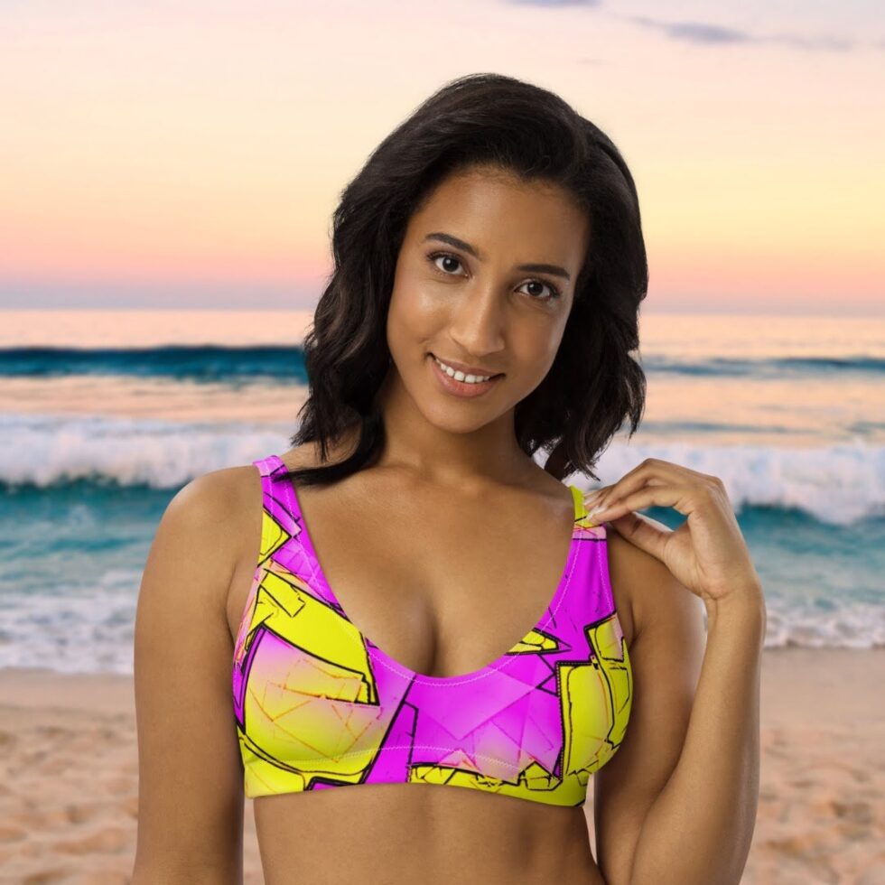 Bikini topa rozā un dzeltenie toņi savijas grafiskā, ritmiskā rakstā, kas atgādina digitālu pulsāciju vai abstraktu mūzikas vilni. Dizains ir drosmīgs, bet harmonisks – radīts, lai izceltu Tavu enerģiju un kustību brīvību.