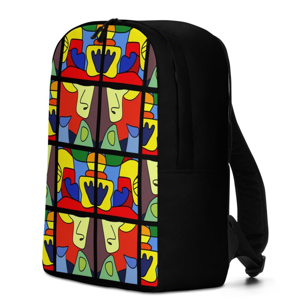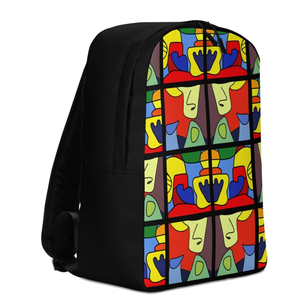Mugursomas dizaina pamatā ir izmantotas stilizētas, kubisma stilā veidotas figūras. Somas melnā pamatkrāsa kombinācijā ar ar piesātinātajiem un krāsainajiem toņiem veido dinamisku harmoniju, kas pārvērš parastu mugursomu par izteiksmīgu mākslas manifestu, akcentējot Tavu drosmīgo, pilsētas stilu.