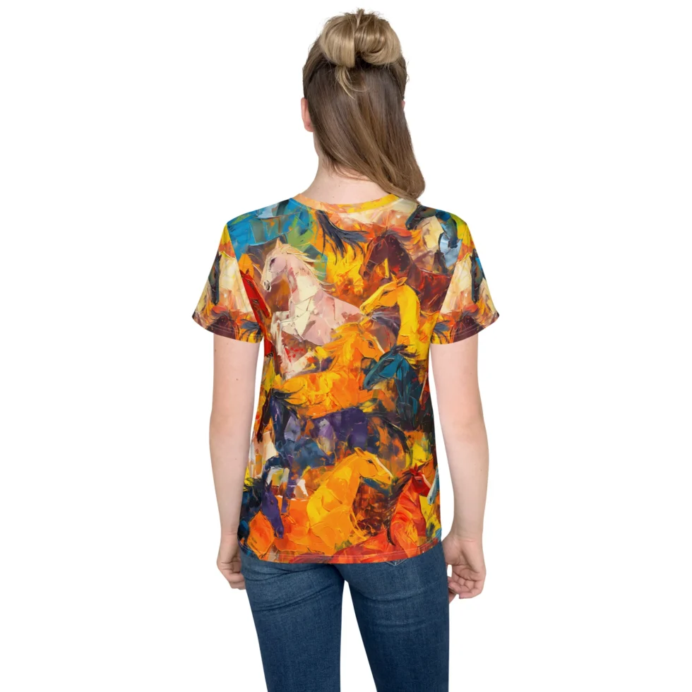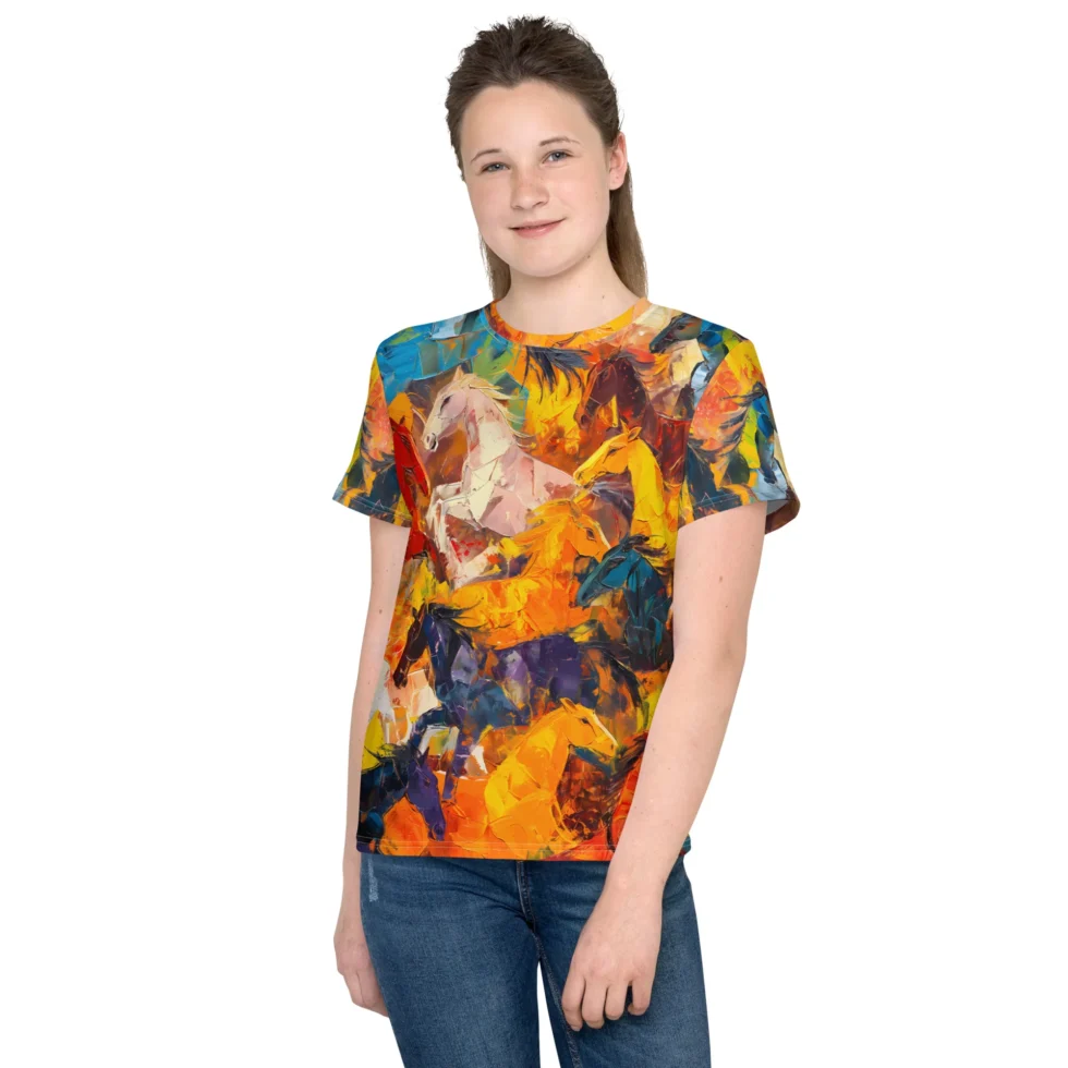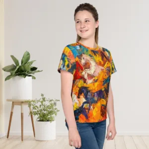 Bērnu un jauniešu T-krekls “Jodie” ar stilizētu joņojošu zirgu dizainu ir lieliska dāvana jebkuram bērnam vai jaunietim, kam patīk piedzīvojumi, daba un stilīgs apģērbs. Košās krāsas atspoguļo neizsīkstošo enerģiu un dzīvesprieku.