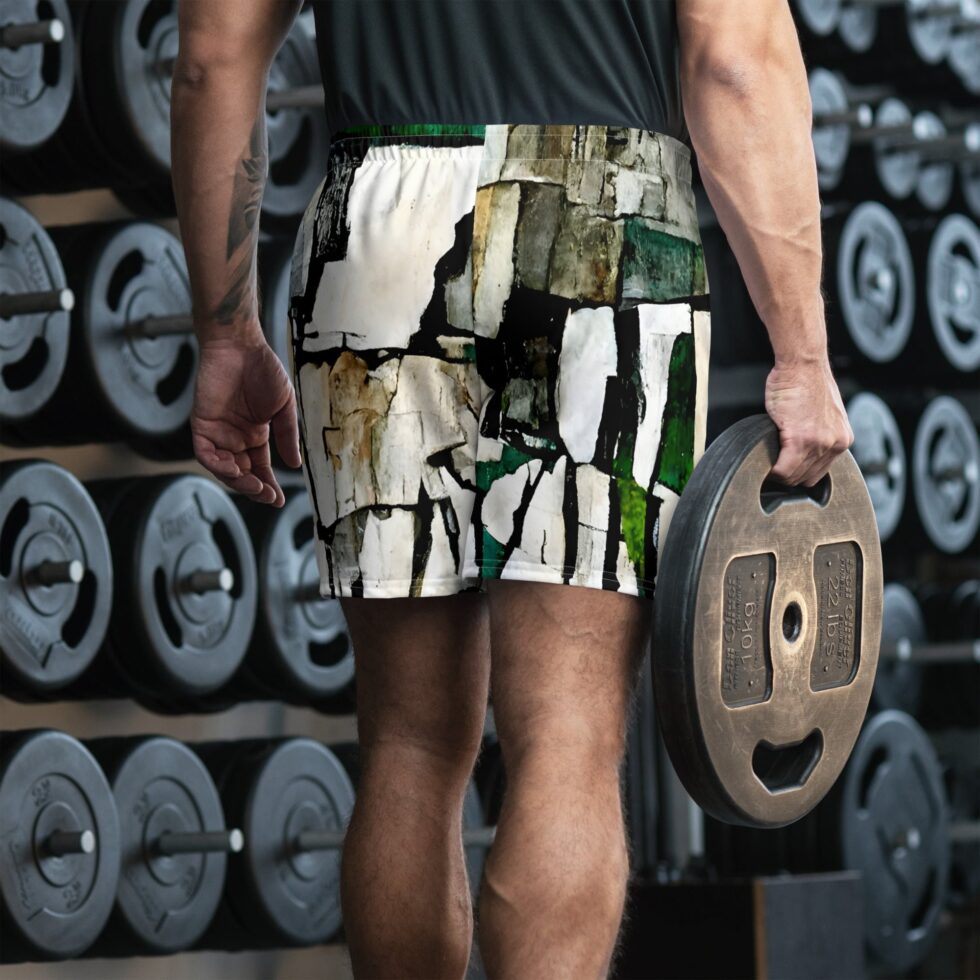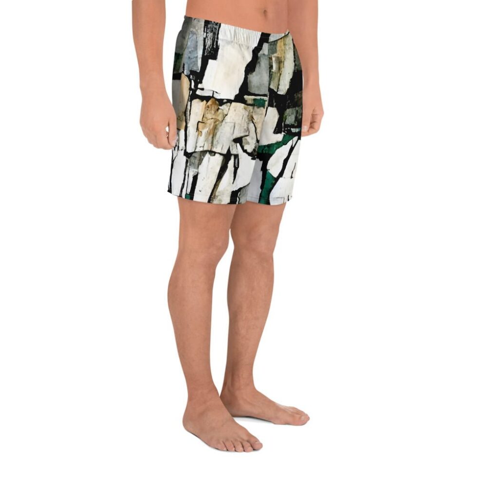 Izcelies ar šiem oriģinālajiem vīriešu šortiem! To drosmīgā apdruka atgādina teksturētu akmeņu kolāžu, kur gaiši pelēkie, smilšu krāsas un melnie laukumi savijas ar zaļu akcentu. Šis dizains iemieso urbānu estētiku, piešķirot sporta apģērbam raksturu.