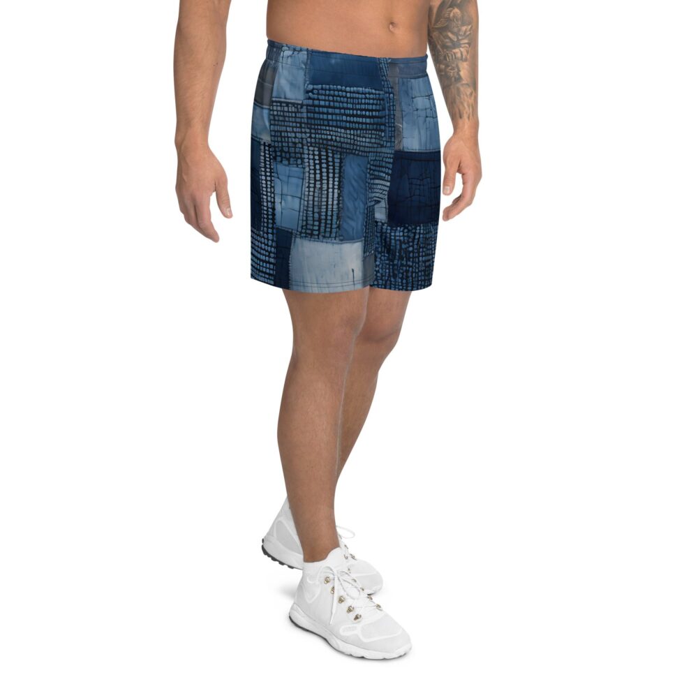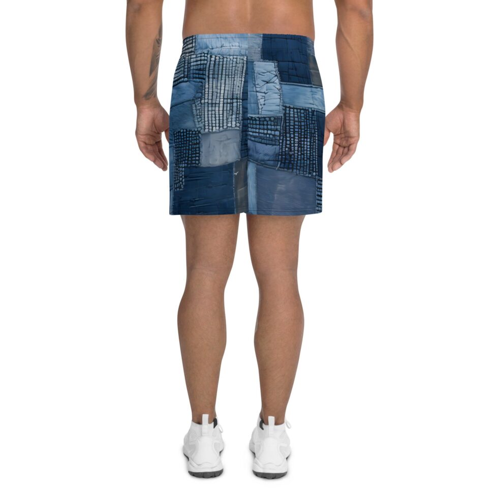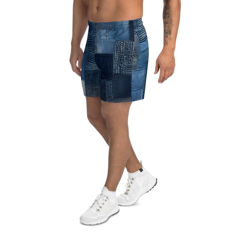 Šortu apdruka imitē denim patchwork efektu – tumši zili, abstrakti krāsu laukumi ar grafiskiem rakstiem rada dziļumu un mūsdienīgu, urbānu tekstūru. Šis ir ideāls apģērbs vīrietim, kurš novērtē stila un funkcionalitātes apvienojumu.